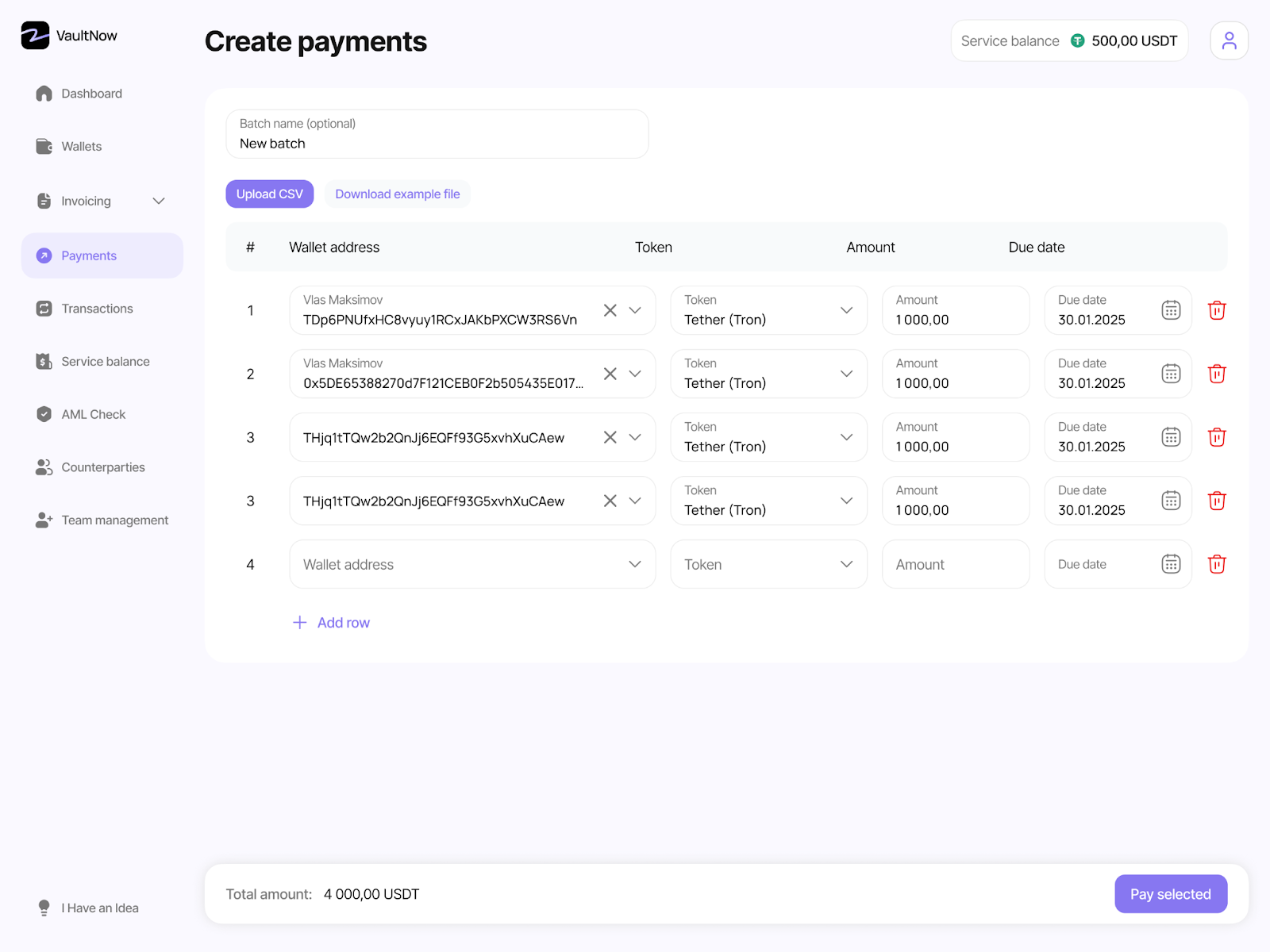 В VaultNow грузишь CSV со списком или выбираешь реквизиты из адресной книги — и отправляешь все одним подтверждением. Восемьдесят выплат за несколько минут, все транзакции сразу в аналитике.