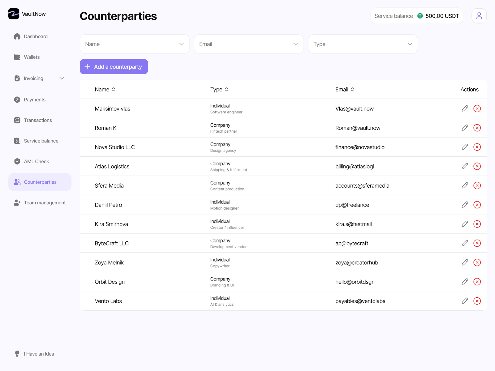 3. Добавить контрагентов — на вкладке Counterparties вы добавляете контрагентов, чтобы избежать опечаток в адресах их кошельков при повторных платежах.