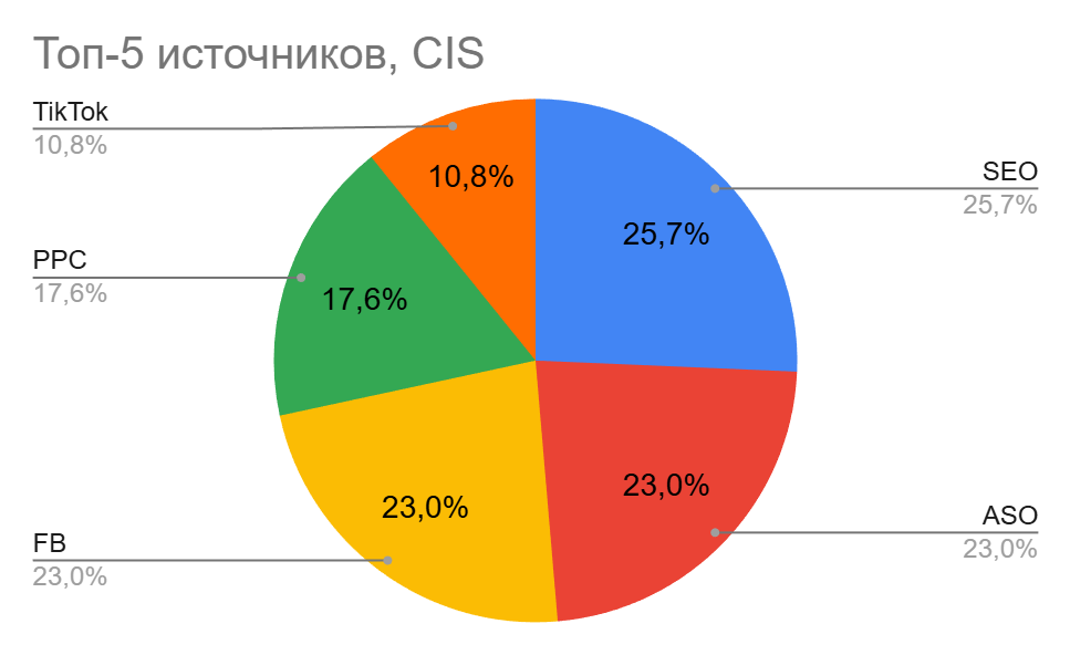 В СНГ структура заметно отличается от остальных регионов: здесь лидируют SEO (25,7%) и ASO (23,0%), что отражает сильный фокус на качество (органику и мобильный поиск). Это логично для региона, где большое значение имеют брендовые запросы и продвижение через приложения.