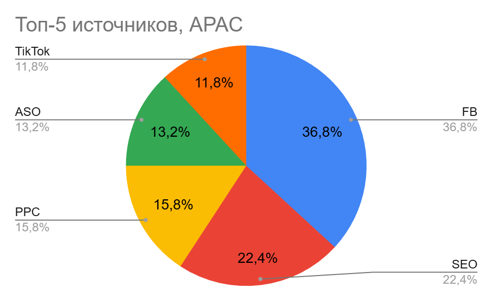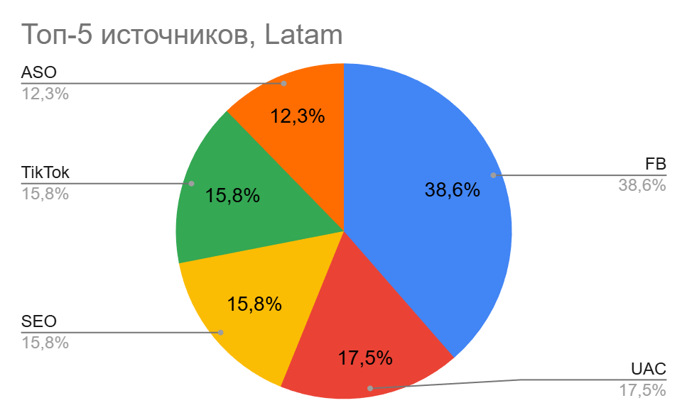 По данным за 2025 год, главный канал трафика — Facebook (38,6%). Но регион не держится только на нем — заметную роль играют UAC (17,5%) и SEO (15,8%). Это значит, что трафик идет не только через соцсети, но и через поиск и рекламу в Google.