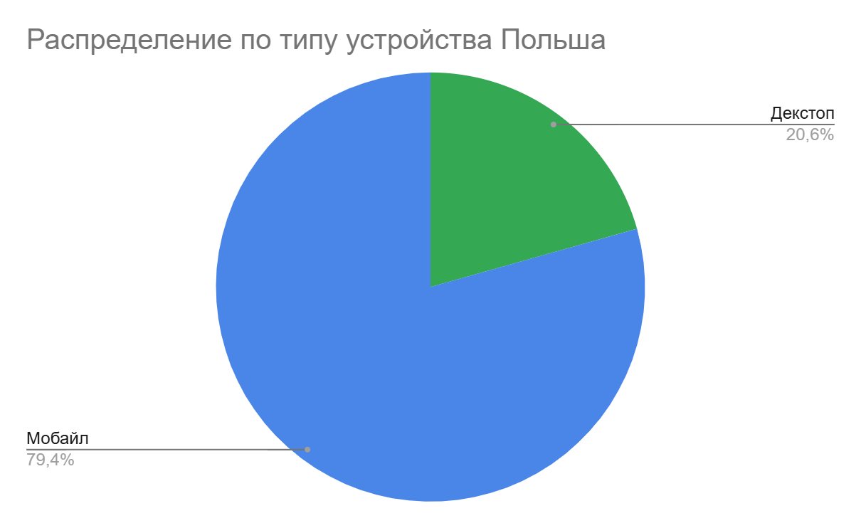 Мобайл доминирует с долей 79%, десктоп занимает 21%.