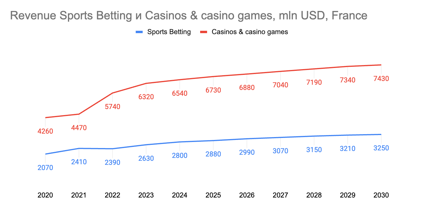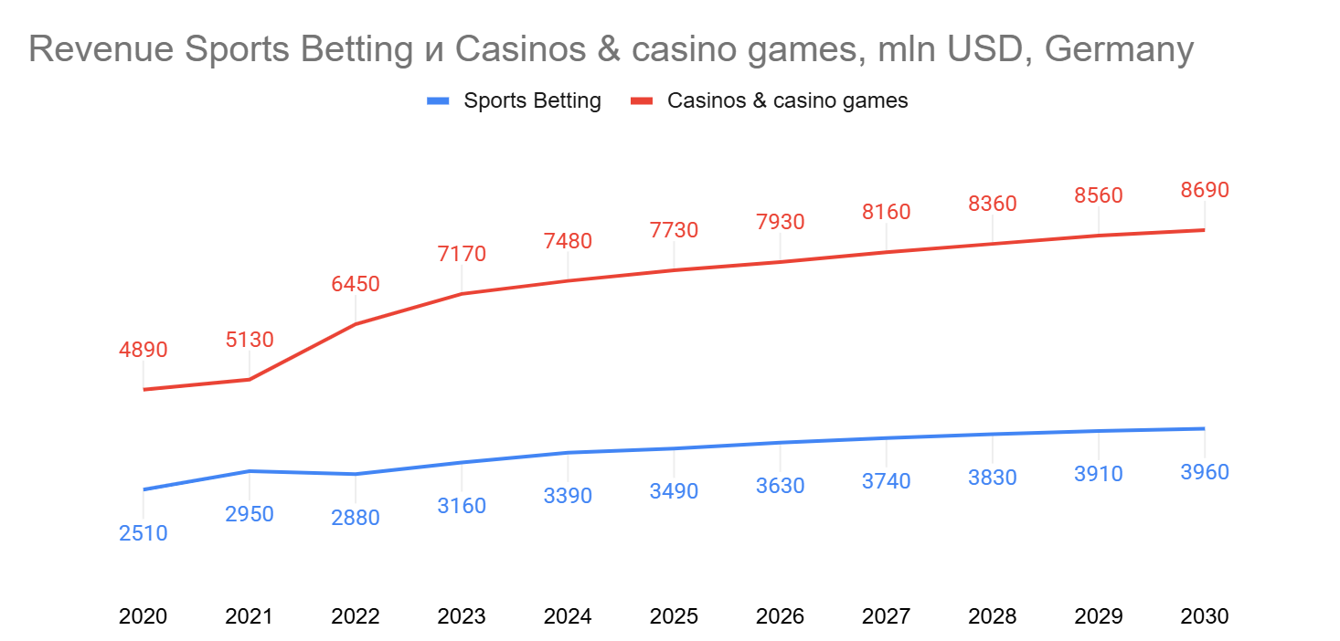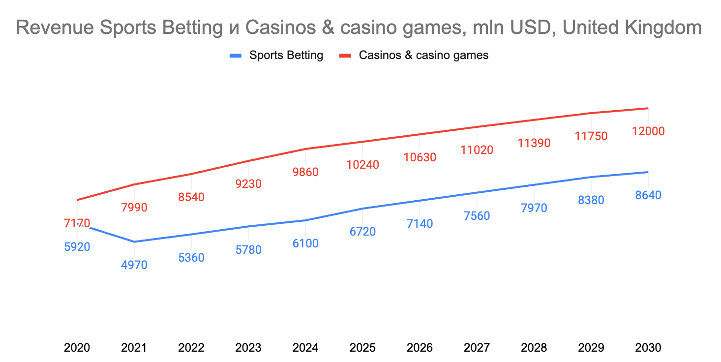 Вертикали меняются местами по темпам: казино пока крупнее, но беттинг растет быстрее и к 2030 году должен выйти в лидеры.