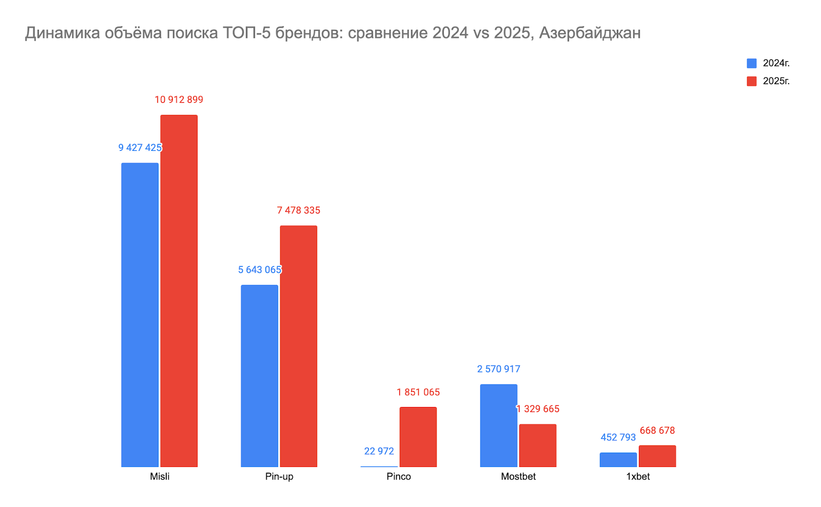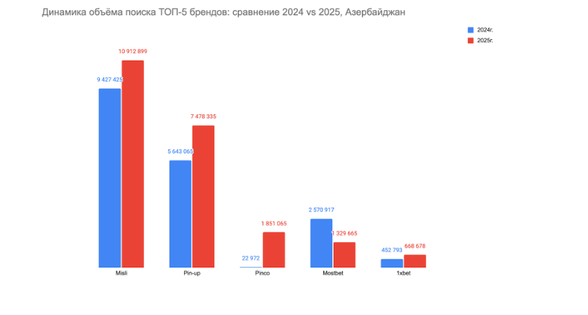 Легальный Misli (+1,5 млн запросов) растет за счет масштабной баннерной рекламы на новостных порталах, партнерств с национальной лотереей (Azerlotereya) и коллабораций с футбольными блогерами.