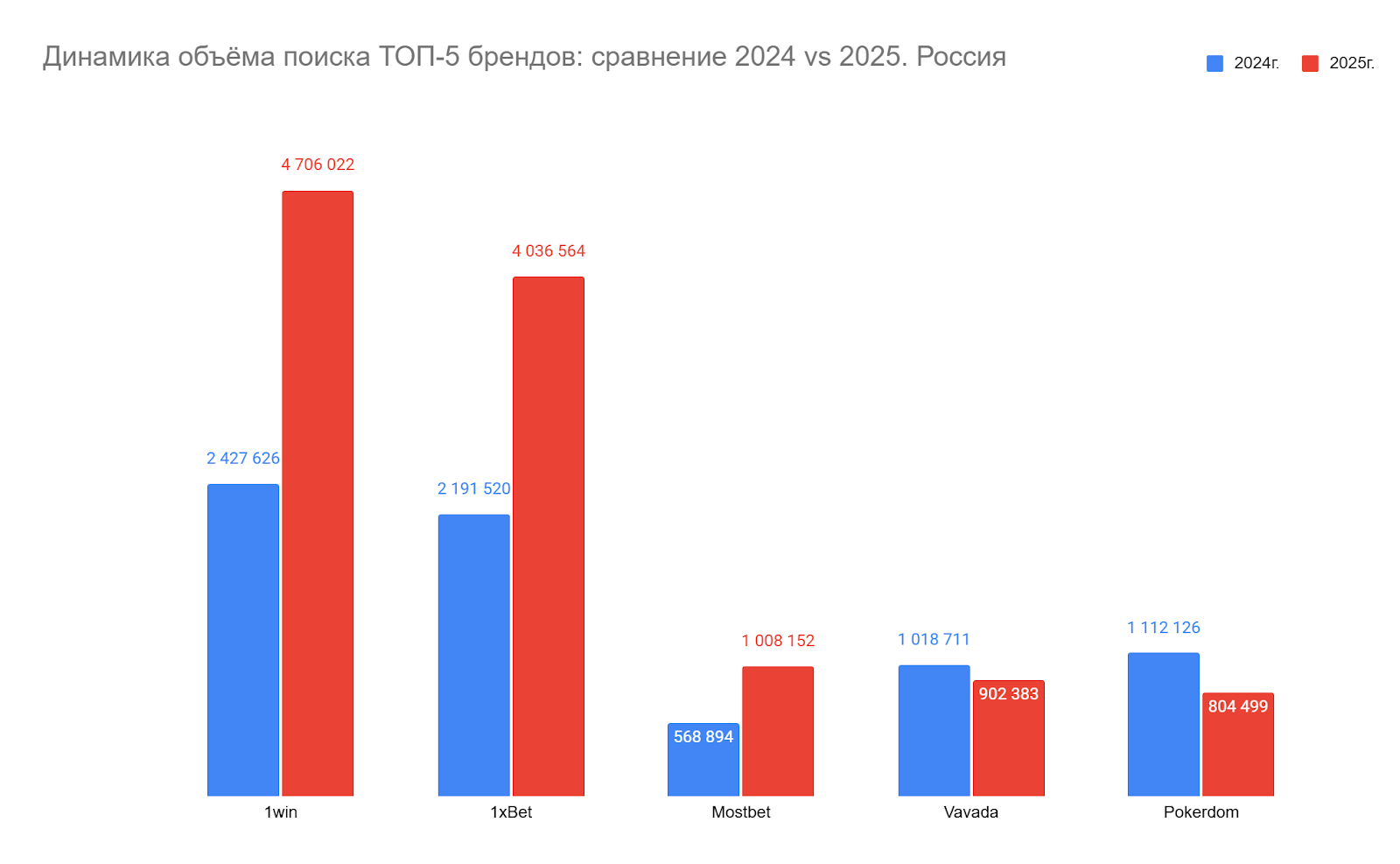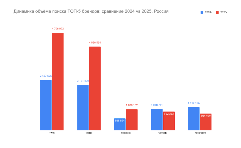 Главным героем года стал бренд GrandPashaBet (+48 млн запросов). Когда весной в стране объявили бойкот лицензионным букмекерам, этот офшорный оператор перехватил весь трафик. Его стратегия — продвижение на пиратских сайтах. Бренд скупил прероллы на всех популярных ресурсах с нелегальными трансляциями матчей и сериалов.